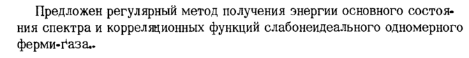 Предложен регулярный метод получения энергии основного состояния спектра и корреляционных функций слабонеидеального одномерного ферми-г^аза,.
