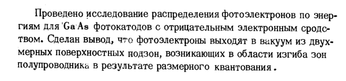 Проведено исследование распределения фотоэлектронов по энергиям для Ga As фотокатодов с отрицательным электронным сродством. Сделан вывод, что фотоэлектроны выхода в вакуум из двухмерных поверхностных подзон, возникающих в области изгиба зон полупроводника в результате размерного квантования.