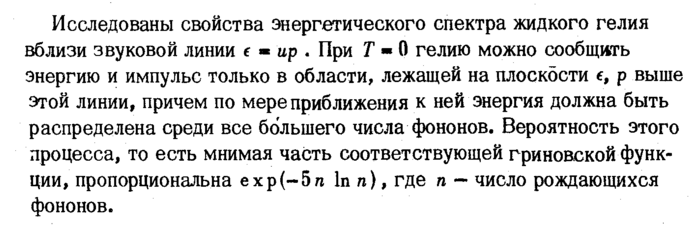 Исследованы свойства энергетического спектра жидкого гелия вблизи звуковой линии е up . При Τ 0 гелию можно сообщить энергию и импульс только в области, лежащей на плоскости е, ρ выше этой линии, причем по мере приближения к ней энергия должна быть распределена среди все большего числа фононов. Вероятность этого процесса, то есть мнимая часть соответствующей гриновской функции, пропорциональна ехр(-5л In га), где га — число рождающихся фононов.