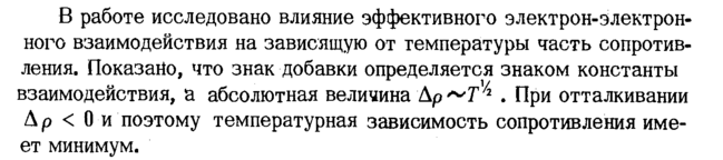 В работе исследовано влияние эффективного электрон-электронного взаимодействия на зависящую от температуры часть сопротивления. Показано, что знак добавки определяется знаком константы взаимодействия, а абсолютная величина Δρ*~Τ/2 . При отталкивании Δρ < 0 и поэтому температурная зависимость сопротивления имеет минимум.