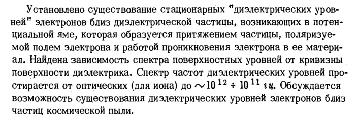 Установлено существование стационарных "диэлектрических уровней" электронов близ диэлектрической частицы, возникающих в потенциальной яме, которая образуется притяжением частицы, поляризуемой полем электрона и работой проникновения электрона в ее материал. Найдена зависимость спектра поверхностных уровней от кривизны поверхности диэлектрика. Спектр частот диэлектрических уровней простирается от оптических (для иона) до ^1012 * 10 11 гц. Обсуждается возможность существования диэлектрических уровней электронов близ частиц космической пыли.