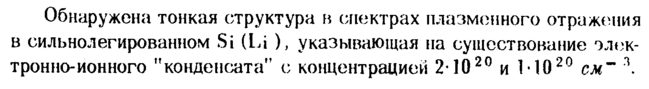 Обнаружена тонкая структура в спектрах плазменного отражения в сильнолегированном Si (Li ), указывающая на существование электронно-ионного "конденсата" с концентрацией 2-1020 и 1-10 20 см" \