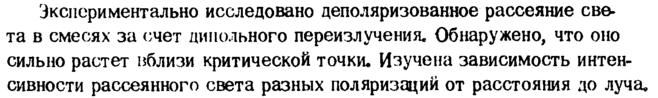 Экспериментально исследовано деполяризованное рассеяние света в смесях за счет дипольного переизлучения. Обнаружено, что оно сильно растет вблизи критической точки* Изучена зависимость интенсивности рассеянного света разных поляризаций от расстояния до луча.
