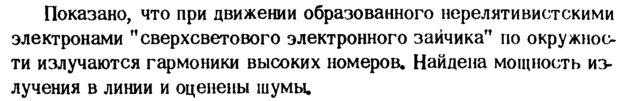Показано, что при движении образованного нерелятивистскими электронами "сверхсветового электронного зайчика" по окружности излучаются гармоники высоких номеров. Найдена мощность излучения в линии и оценены шумы.