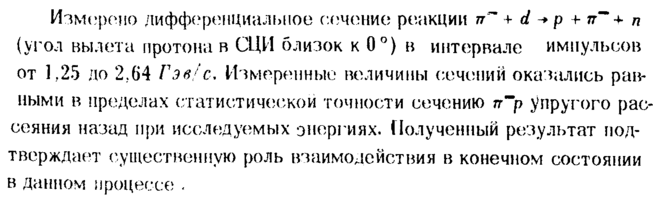Измерено дифференциальное сечение реакции тг™ + d ~» ρ + я-"* + η {угол вылета протона в СЦИ близок к 0°) в интервале импульсов от 1,25 до 2.64 Гэв/сш Измеренные величины сечений оказались равными в пределах статистической точности сечению п~р упругого рассеяния назад при исследуемых энергиях. Полученный результат подтверждает существенную роль взаимодействия в конечном состоянии в Данном процессе .