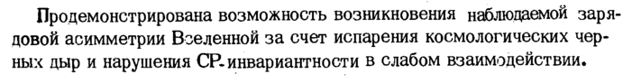 Продемонстрирована возможность возникновения наблюдаемой зарядовой асимметрии Вселенной за счет испарения космологических черных дыр и нарушения СР. инвариантности в слабом взаимодействии.