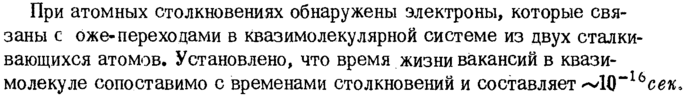 При атомных столкновениях обнаружены электроны, которые связаны с оже-переходами в квазимолекулярной системе из двух сталкивающихся атомов. Установлено, что время жизни вакансий в квазимолекуле сопоставимо с временами столкновений и составляет ^10~1всек>