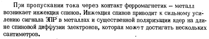 При пропускании тока через контакт ферромагнетик металл возникает инжекция спинов. Инжекция спинов приводит к сильному усилению сигнала ЭПР в металлах и существенной поляризации ядер на длине спиновой диффузии электронов, которая может достигать нескольких сантиметров.