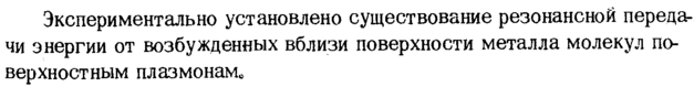 Экспериментально установлено существование резонансной переда-чи энергии от возбужденных вблизи поверхности металла молекул поверхностным плазмонамо