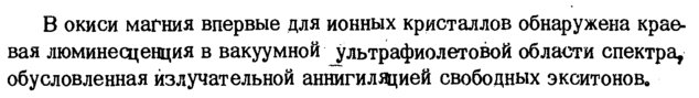 В окиси магния впервые для ионных кристаллов обнаружена краевая люминесценция в вакуумной ^ультрафиолетовой области спектра, обусловленная йзлучательной аннигиляцией свободных экситонов.