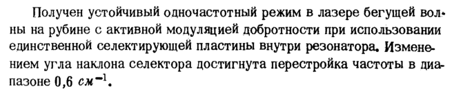 Получен устойчивый одночастотный режим в лазере бегущей вол* ны на рубине с активной модулэдией добротности при использовании единственной селектирующей пластины внутри резонатора. Изменением угла наклона селектора достигнута перестройка частоты в диа-пазоне 0,6 см~1*