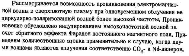 Рассматривается возможность проникновения электромагнитной волны в сверхплотную плазму при одновременном облучении ее циркулярно-поляризованной волной более высокой частоты. Проникновение обусловлено индуцированием высокочастотной волной за счет обратного эффекта Фарадея постоянного магнитного поля. Приведены количественные оценки применительно к случаю, когда двумя волнами являются излучения соответственно С02и Nd-лазеров.