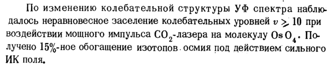 По изменению колебательной структуры УФ спектра наблюдалось неравновесное заселение колебательных уровней ν >, 10 при воздействии мощного импульса С02-лазера на молекулу Os04Получено 15%-ное обогащение изотопов , осмия под действием сильного ИК поля.