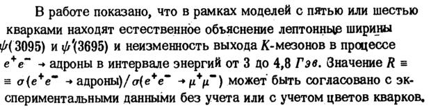 В работе показано, что в рамках моделей с пятью или шестью кварками находят естественное объяснение лептощще ширины ^( 3095) и ^'(3695) и неизменность выхода К-мезонов в процессе е+е" адроны в интервале энергий от 3 до 4,8 Гэв. Значение R = — а(е*е~ -> адроны)/а(е*е~ -»μ*μ~) может быть согласовано с экспериментальными данными без учета или с учетом цветов кварков.
