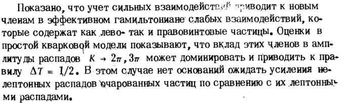 Показано, что учет сильных взаимодейств.# приводит к новым членам в эффективном гамильтониане слабых взаимодействий, которые содержат как лево* так и правовинтшые частицы. Оценки в простой кварков<|й модели показывают, что вадад этих членов в амплитуды распадов К -> 2π,3π может доминировать и приводить к правилу Δ 7 = |/2· В этом случае нет оснований ожидать усиления не-лептонных распадов Очарованных частиц по сравнению с их лептонныу ми распадами.