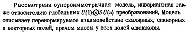 Рассмотрена суперсимметричная модель, инвариантная также относительно глобальных U{l)0SU(n) преобразований. Модель описывает перенормируемое взаимодействие скалярных, спинорных и векторных полей, причем массы у всех полей одинаковы.