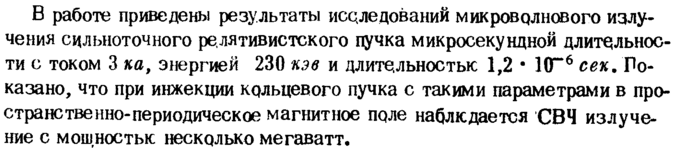 В работе приведены результаты исследований микроволнового излучения сильноточного релятивистского пучка микросекундной длительности с током 3 ка, энергией 230 кэв и длительностью 1,2 · 1(Г6 сек. Показано, что при инжекции кольцевого пучка с такими параметрами в пространственно-периодическое магнитное поле наблюдается СВЧ излучение с мощностью несколько мегаватт.