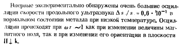 Впервые экспериментально обнаружены очень большие осцилляции скорости продольного ультразвука &$./s.* Ο,θ · lO"1 в нормальном состоянии металла при низкой температуре. Осцилляции происходят при ω г ~Л как при изменении величины магнитного ноля, так и при изменении его ориентации в плоскости 1Ц L