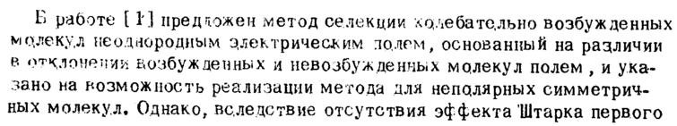 Е работе [ 1*] предложен метод селекции хо;лебатс,льно возбужденных молекул неоднородным электрическим ло.лгм, основанный на различии в отклонении возбужденных и невозбужденных молекул полем , и указано на возможность реализации метода для неполярных симметричных молекул. Однако, вследствие отсутствия эффекта Штарка первого