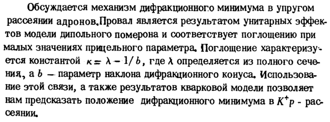 Обсуждается механизм дифракционного минимума в упругом рассеянии адронов,Провал является результатом унитарных эффектов модели дипольного померона и соответствует поглощению при малых значениях прицельного параметра. Поглощение характеризуется константой к= λ 1/6, где λ определяется из полного сечения, а £> — параметр наклона дифракционного конуса. Использование этой связи, а также результатов кварковой модели позволяет нам предсказать положение дифракционного минимума в К+р рассеянии.