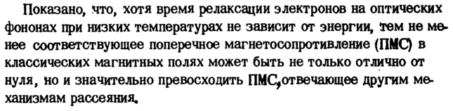 Показано, что, хотя время релаксации электронов на оптических фононах при низких температурах не зависит от энергии, тем не менее соответствующее поперечное магнетосопротивление (ПМС) в классических магнитных полях может быть не только отлично от нуля, но и значительно превосходить ПМС,отвечающее другим механизмам рассеяния.