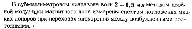 В субмиллиметровом диапазоне волн 2 0,5 мм методом двойной модуляции магнитного поля измерены спектры поглощения мелких доноров при переходах электронов между возбужденными состояниями, (