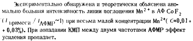 Экспериментально обнаружена и теоретически объяснена аномально большая интенсивность линии поглощения Μη2 + в αφ CoF2 f примеси ■/ 'αΦΜΡ^' 1|Ри весьма мал°й концентрации Мп2+( 00,01 + 0.03%). При попадании КМП между двумя частотами АФМР эффект усиления пропадает.