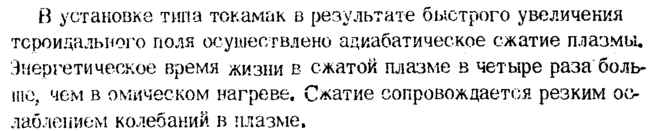 β установке типа токамак в результате быстрого увеличения тороидального поля осуществлено адиабатическое сжатие плазмы. Энергетическое время жизни в сжатой плазме в четыре раза больше, чем в омическом нагреве. Сжатие сопровождается резким ослаблением колебаний в плазме.