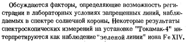 Обсуждаются факторы, определяющие возможность регистрации в лабораторных условиях запрещенных линий, наблюдаемых в спектре солнечной короны. Некоторые результаты спектроскопических измерений на установке "Токамак-4" интерпретируются как наблюдение "зеленой линии" иона FeXIV.