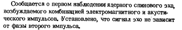 Сообщается о первом наблюдении ядерного спинового эха, возбуждаемого комбинацией электромагнитного и акустического импульсов. Установлено, что сигнал эхо не зависит от фазы второго импульса.