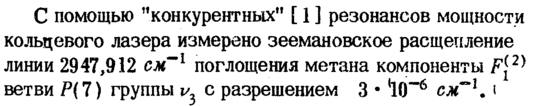 С помощью "конкурентных" [ 1 ] резонансов мощности кольцевого лазера измерено зеемановское расщепление линии 2947,912 емГ1 поглощения метана компоненты F[2) ветви Р(7) группы ι/ с разрешением 3 · Ίθ"6 слГ1. \