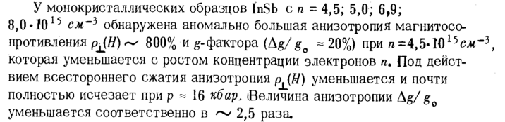 У монокристаллических образцов TnSb с η = 4,5; 5,0; 6,9; 8,0 ΊΟ15 см'3 обнаружена аномально большая анизотропия магнитосо-противления ρχ(#) ~800% и g-фактора (Ag/go ^20%) при η =4,5·Ι015^-3, которая уменьшается с ростом концентрации электронов п. Под действием всестороннего сжатия анизотропия р^Н) уменьшается и почти полностью исчезает при ρ * 16 кбар* (Величина анизотропии Ag/ g0 уменьшается соответственно в ~ 2,5 раза.