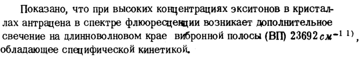 Показано, что при высоких концентрациях экситонов в кристаллах антрацена в спектре флюоресценции возникает дополнительное свечение на длинноволновом крае вибронной полосы (ВП) 23692 см'1 1), обладающее специфической кинетикой.