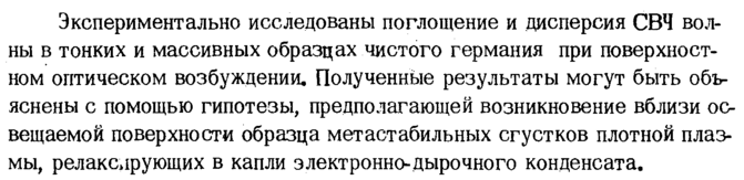 Экспериментально исследованы поглощение и дисперсия СВЧ волны в тонких и массивных образцах чистого германия при поверхностном оптическом возбуждении. Полученные результаты могут быть объяснены с помощью гипотезы, предполагающей возникновение вблизи освещаемой поверхности образца метастабильных сгустков плотной плазмы, релакслрующих в капли электронно-дырочного конденсата.