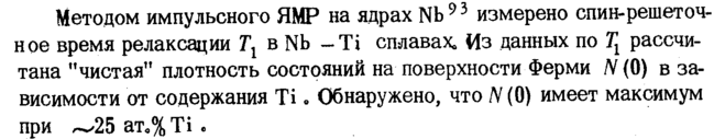 Методом импульсного ЯМР на ядрах Nb93 измерено спин-решеточное время релаксации 7\ в Nb -Ti сплавах. Из данных по 7J рассчитана "чистая" плотность состояний на поверхности Ферми N (0) в зависимости от содержания Ti. Обнаружено, что N (0) имеет максимум при ^25 атД Ti.