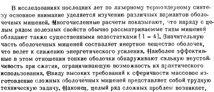 В исследованиях последних лет по лазерному термоядерному синтезу основное внимание уделяется изучению различных вариантов оболо-чечных мишеней. Многочисленные расчеты показывают, что наряду с целым рядом полезных свойств обычно рассматриваемые типы мишеней обладают также существенными недостатками [1 4]. Значительную часть оболочечных мишеней составляет инертное вещество оболочек, что ведет к снижению энергетического усиления. Наиболее эффективные в этом отношении тонкие оболочки обнаруживают сильную неустойчивость при сжатии, ограничивающую возможность их практического использования. «Ввиду высоких требований к сферичности массовое изготовление сложных оболочечных мишеней представляет собой трудную техническую задачу. 'Наконец, целый ряд сложных проблем, возникает,