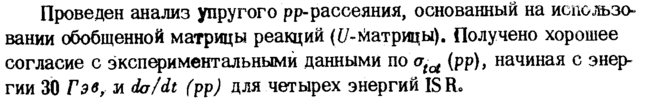 Проведен анализ упругого рр-рассеяния, основанный на использовании обобщенной матрицы реакций (ί/~ Матрицы). Получено хорошее согласие с экспериментальными данными по аш (рр), начиная с энергии 30 Гэб, и da fit (рр) для четырех энергий ISR*