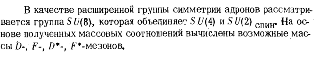 В качестве расширенной группы симметрии адронов рассматривается группа S£/(8>, которая объединяет SU(4) и 5 6/(2) спш На основе полученных массовых соотношений вычислены возможные массы /)*-, 'F"-мезонов.