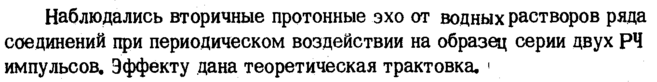 Наблюдались вторичные протонные эхо от водных растворов ряда соединений при периодическом воздействии на образец серии двух РЧ импульсов. Эффекту дана теоретическая трактовка. 1