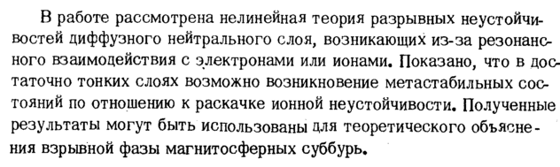 В работе рассмотрена нелинейная теория разрывных неустойчи-востей диффузного нейтрального слоя, возникающих из-за резонансного взаимодействия с электронами или ионами. Показано, что в достаточно тонких слоях возможно возникновение метастабильных состояний по отношению к раскачке ионной неустойчивости. Полученные результаты могут быть использованы для теоретического объяснения взрывной фазы магнитосферных суббурь.