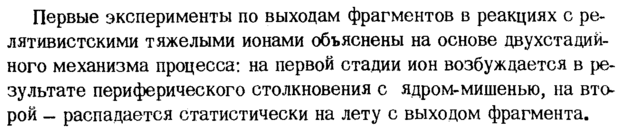 Первые эксперименты по выходам фрагментов в реакциях с релятивистскими тяжелыми ионами объяснены на основе двухстадий-ного механизма процесса: на первой стадии ион возбуждается в результате периферического столкновения с ядром-мишенью, на второй распадается статистически на лету с выходом фрагмента.