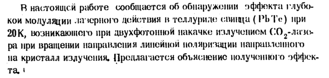 R настоящей работе сообщается об обнаружении эффекта глубокой модуляции лазерного действия в теллуриде свинца ( РЬТе) при 20К, возникающего при двухфотонной накачке излучением С02-лачо-ра при вращении направления линейной поляризации направленного на кристалл излучения. Предлагается объяснение полученного эффекта. »