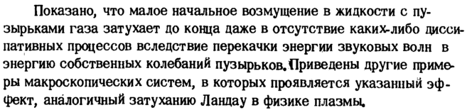 Показано, что малое начальное возмущение в жидкости с пузырьками газа затухает до конца даже в отсутствие каких-либо дисси-пативных процессов вследствие перекачки энергии звуковых волн в энергию собственных колебаний пузырьков. Приведены другие примеры макроскопических систем, в которых проявляется указанный эффект, аналогичный затуханию Ландау в физике плазмы.