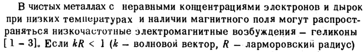 В чистых металлах с неравными концентрациями электронов и дырок при низких температурах и наличии магнитного поля могут распространяться низкочастотные электромагнитные возбуждения — геликоны [ 1 3]и Если kR < 1 (к волновой вектор, R — ларморовский радиус)
