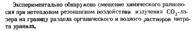 Экспериментально обнаружено смешение химического равновесия при нетепловом резонансном воздействии излучения С02-лазера на границу раздела органического и водного растворов нитрата уранила.