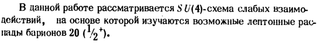В данной работе рассматривается S £/(4)-схема слабых взаимодействий, на основе которой изучаются возможные лептонные распады барионов 20 (т-?*).