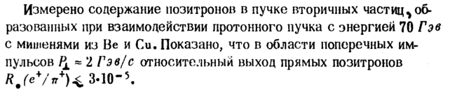 Измерено содержание позитронов в пучке вторичных частиц ^ образованных при взаимодействии протонного пучка с энергией 70 Гэв с мишенями из Be и Си. Показано, что в области поперечных импульсов Рх « 2 Гэв/с относительный выход прямых позитронов /?.fe+/V)^3-10-\