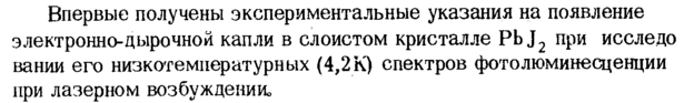 Впервые получены экспериментальные указания на появление электронно-дырочной капли в слоистом кристалле Pb J2 при исследо вании его низкотемпературных (4,2К) спектров фотолюминесценции при лазерном возбуждении*
