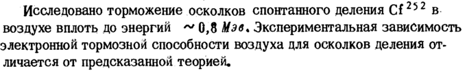 Исследовано торможение осколков спонтанного деления Cf252 в воздухе вплоть до энергий ~ 0,8 Мэв< Экспериментальная зависимость электронной тормозной способности воздуха для осколков деления от» личается от предсказанной теорией.