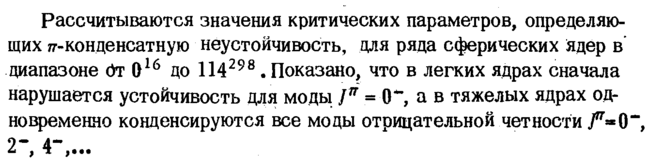 Рассчитываются значения критических параметров, определяющих тг-конденсатную неустойчивость, для ряда сферических ядер в' диапазоне ότΟ16 до 114298. Показано, что в легких ядрах сначала нарушается устойчивость для моды Jv = О", а в тяжелых ядрах одновременно конденсируются все моды отрицательной четности /""«О", 2 , 4 ,···